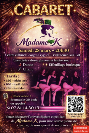 Spectacle de cabaret, venez découvrir l'univers élégant de pétillant de Madame K pour une soirée pleine de charme, de musique et de surprises !En un clic, proposez vos événements sur l'agenda du site de la ville >>>